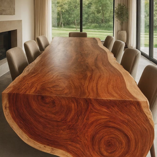 A table that embodies timeless elegance and organic strength. Carved from a single, sustainably sourced Saman wood slab, this statement piece preserves the tree’s original live edges, natural surface textures, and flowing cracks, making every detail uniquely its own.