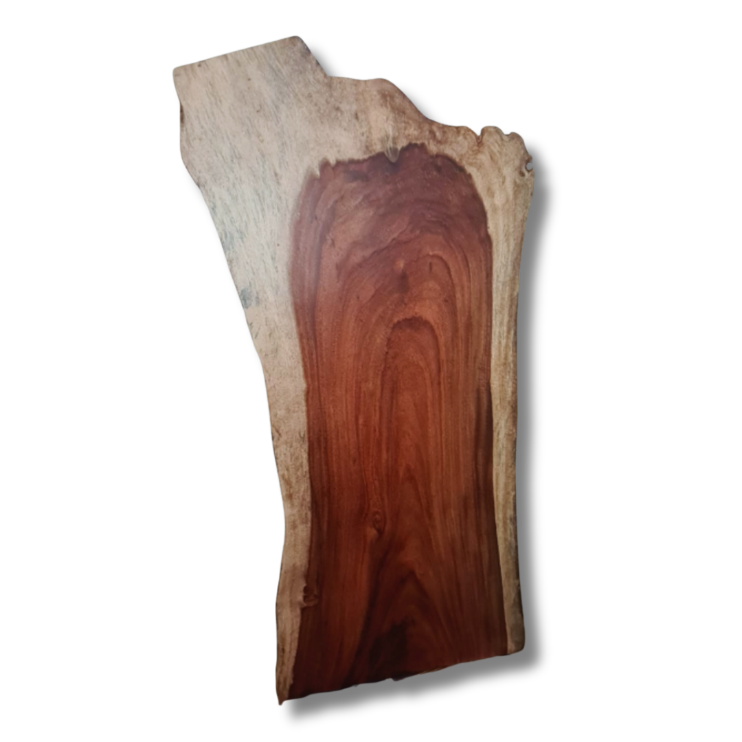 This table is a quiet statement, graceful, eccentric, and unlike any other. Sculpted from a single slab of Saman wood, carries the soul of the tree from which it came. Its slender form flows gently into a semi-rounded end, bursts with wild, unpredictable beauty. A bold natural flourish that defies symmetry and convention.